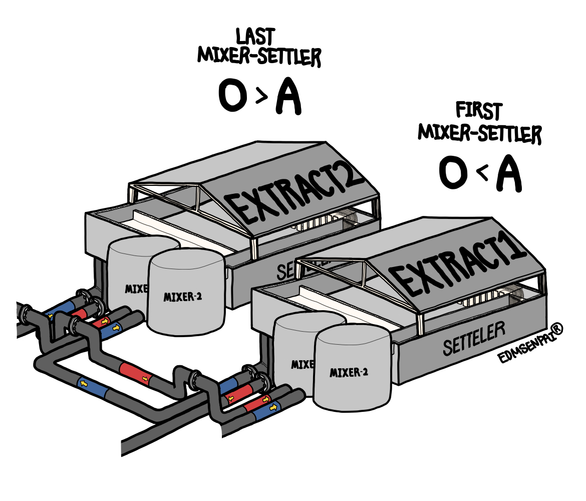 용매추출에 사용되는 추출제의 비용문제와 직접적으로 관련되어 있기 때문에, 공정 밖으로 빠져나가는 유기상을 최소화하기 위하여 일반적으로 선택되는 운전조건입니다.
