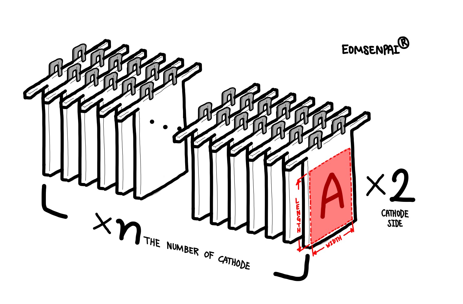 Cellhouse 내의 모든 음극의 전착면적을 의미하며, 따라서 음극의 개수와 전착면적의 곱으로 구할 수 있습니다.