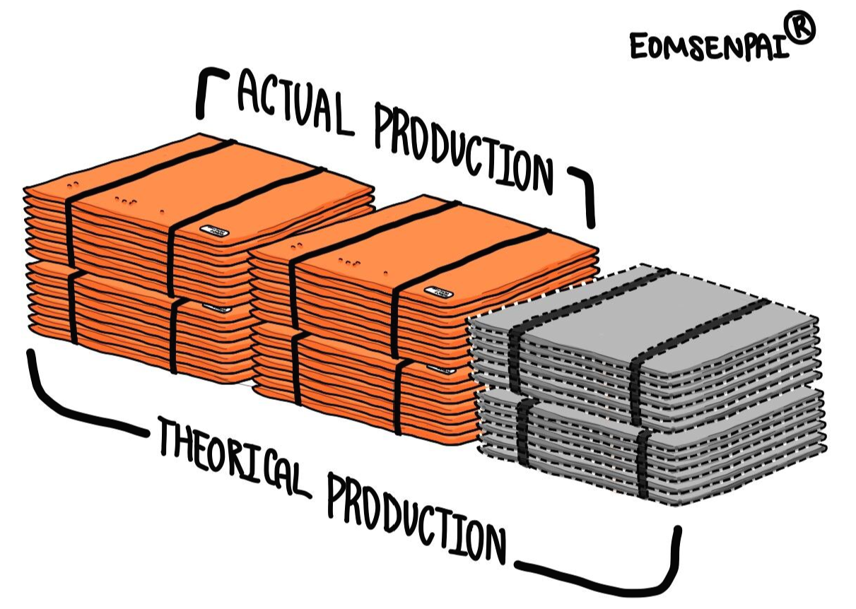실제 공장을 운영하는 경우에는 전류 효율(current efficiency)을 실제 생산량과 이론적으로 생산되는 양의 비율인 식 (2)를 이용하여 계산합니다.