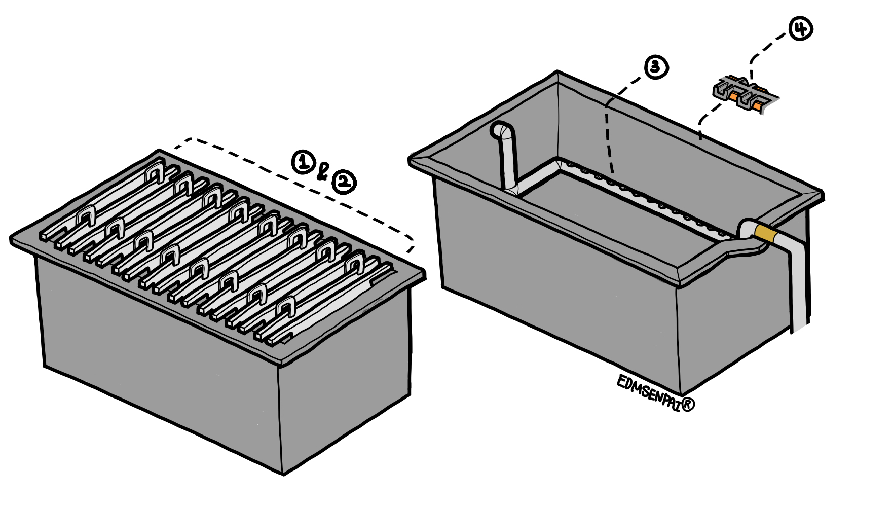· Edge strip(⑤): 절연체(insulator)로, 음극의 모퉁이에 설치되어 양 면에 전착되는 금속이 서로 붙는 것을 방지하여 음극에서 금속의 회수가 용이하도록 도와주는 장치