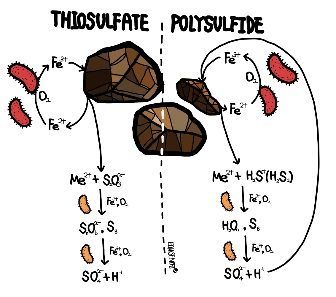 티오설페이트(thiosulfate, -S2O32-) 메커니즘은 광물들이 3가 철이온(ferric ion)에 의하여 산화됩니다. 산화가 수행되는 과정에서 티오설페이트가 형성될 때까지 황과 금속이온 사이이 화학결합이 끊어지지 않습니다 (이 메커니즘의 이름은 가장 먼저 유리되는 황화합물인 티오설페이트 딴 것).