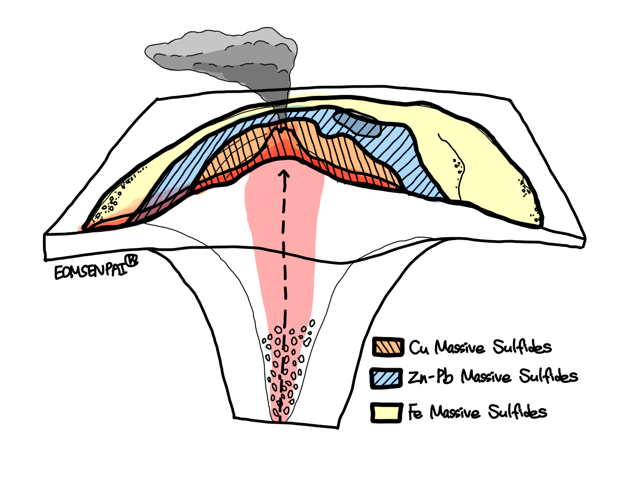 일반적으로 광상에는 목적하는 하나의 금속 이외에도 경제적으로 가치가 있을 수 있는 여러가지의 금속이 포함되어 있을 수도 있습니다. 아래는 대표적인 다금속 광상(Polymetallic Metal Deposit)인 VMS(Volcanogenic Massive Sulfides) 광상입니다.