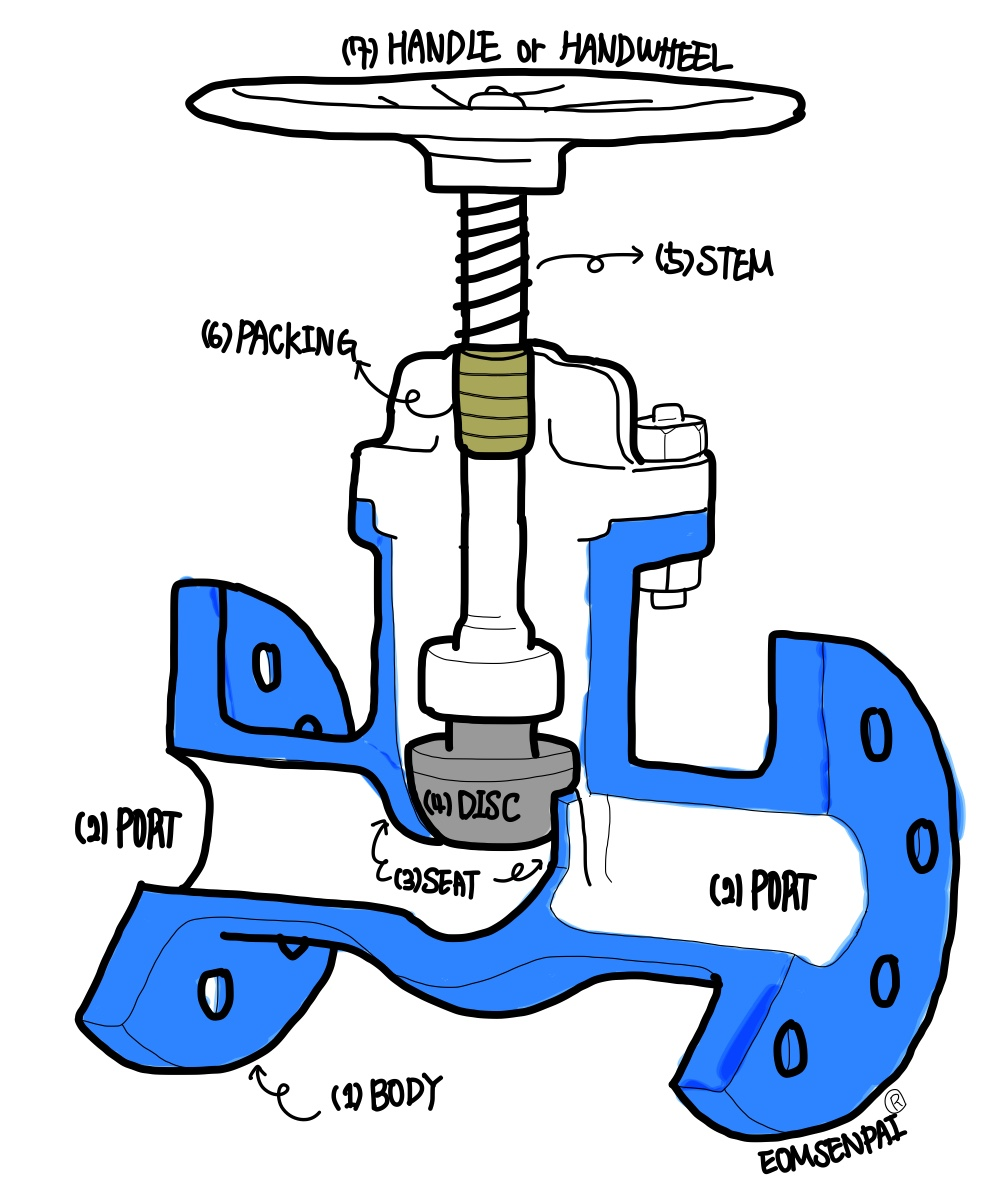 (7) Handle or handwheel: 수동으로 밸브 디스크를 개폐하는 부분으로, 자동으로 조절할 시에는 핸들이 없고 Actuator를 사용함
