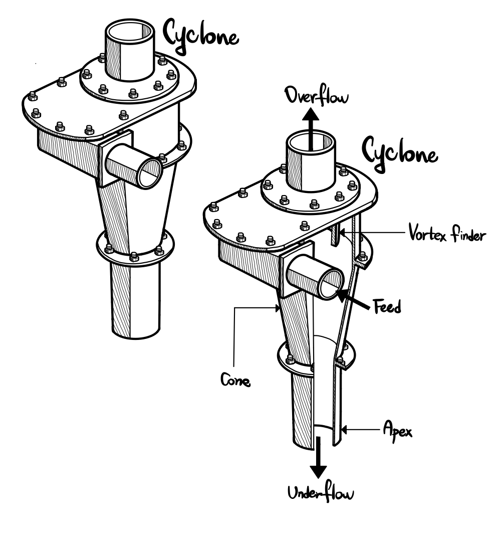 광업 분야에서 주로 사용되는 싸이클론은 습식으로 운전되는 하이드로 싸이클론(hydrocyclone)입니다. 이에 따라서, 해당 글의 내용은 하이드로 싸이클론 혹은 습식 싸이클론에 초점이 맞춰져 있습니다.