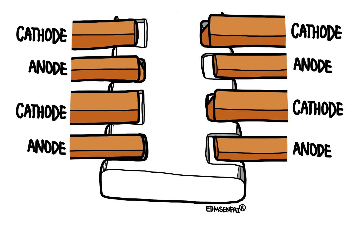 Dog-bone 형태 또한 보편적인 형태의 부스바이며, triangular busbar보다 복잡한 형태를 가지고 있습니다. 가장 일반적인 형태는 위의 구성에서 보셨듯 평평한 continuous busbar의 양쪽 끝에 두 개의 삼각형 접촉부가 있는 모습입니다 (가장 상단의 그림의 좌측그림이 그 예시). 양극/음극 접촉부분이 하나가 아니라 양쪽에 두개가 설치되어 있기 때문에 양극/음극의 행거바는 대칭적입니다.